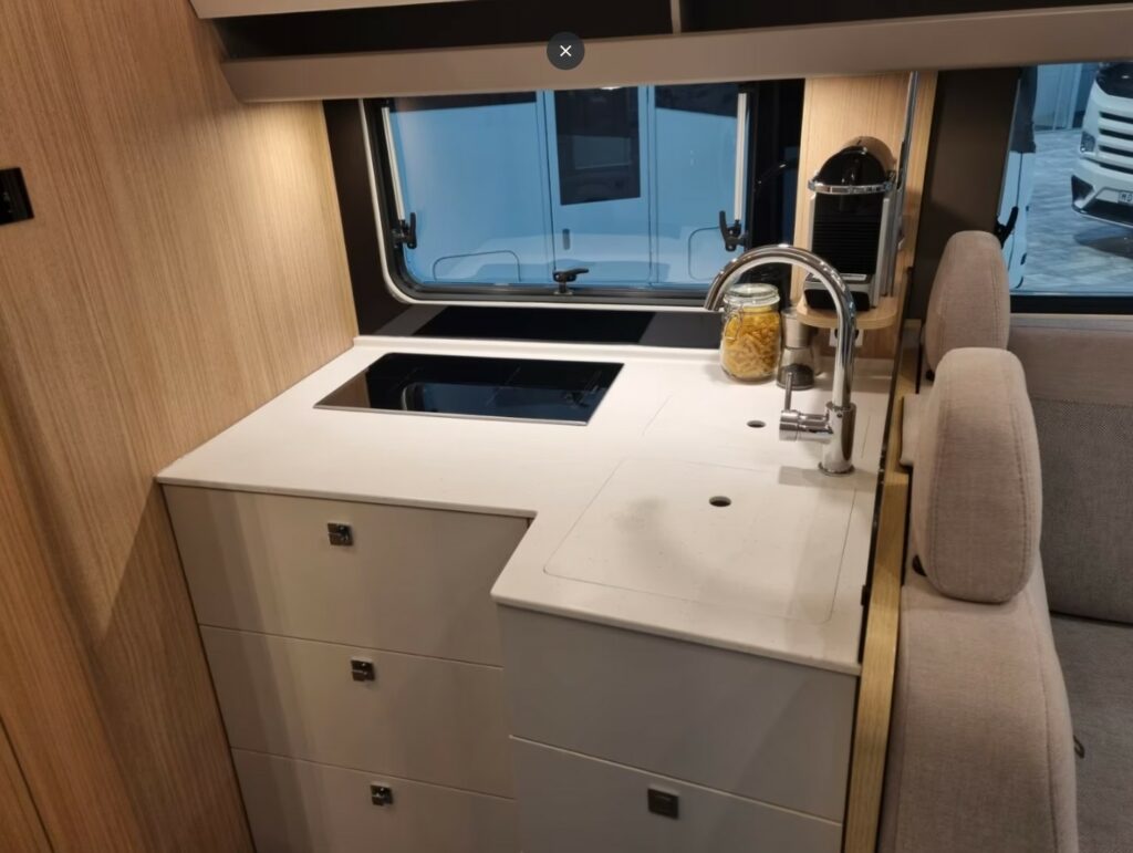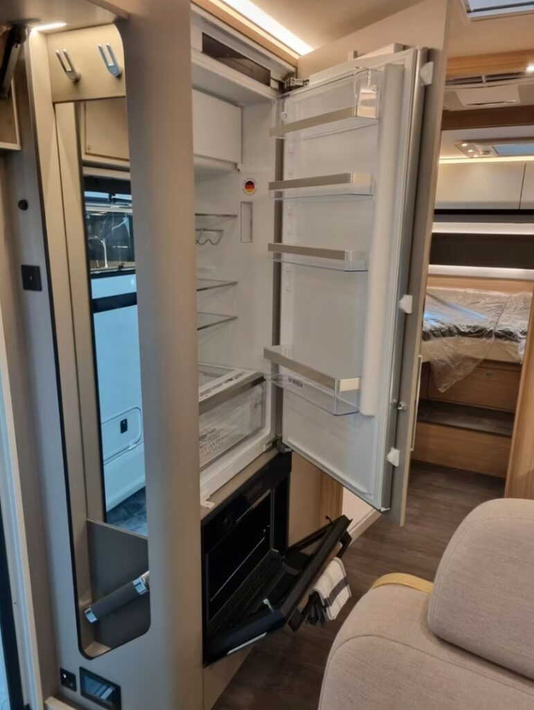 Elektrycznie chowany 32-calowy telewizor w górnej szafce w jadalni (po stronie kierowcy) ze szklankami i soundbarem oraz 27-calowy telewizor w sypialni