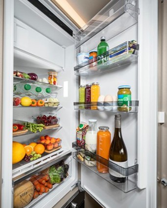 Elektrycznie chowany 32-calowy telewizor w górnej szafce w jadalni (po stronie pasażera) ze szklankami i 27-calowy telewizor w sypialni