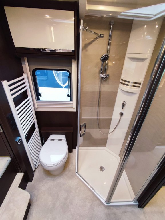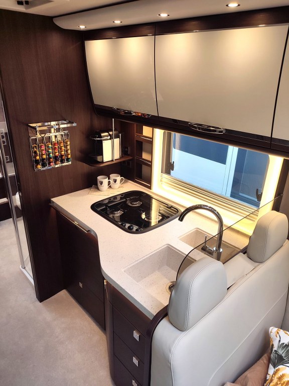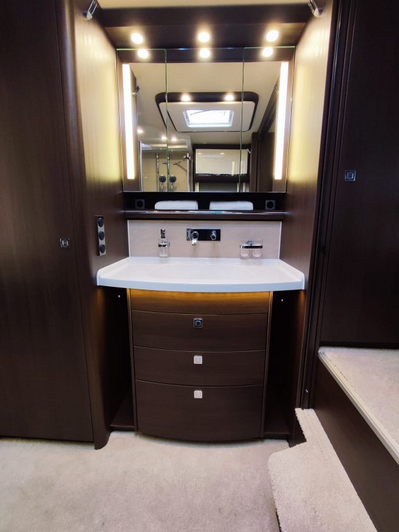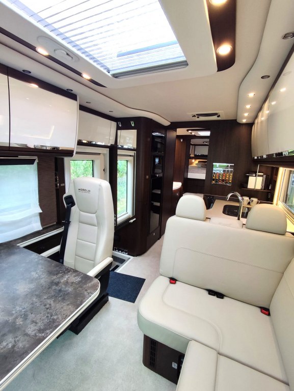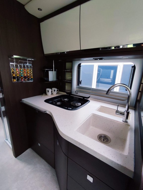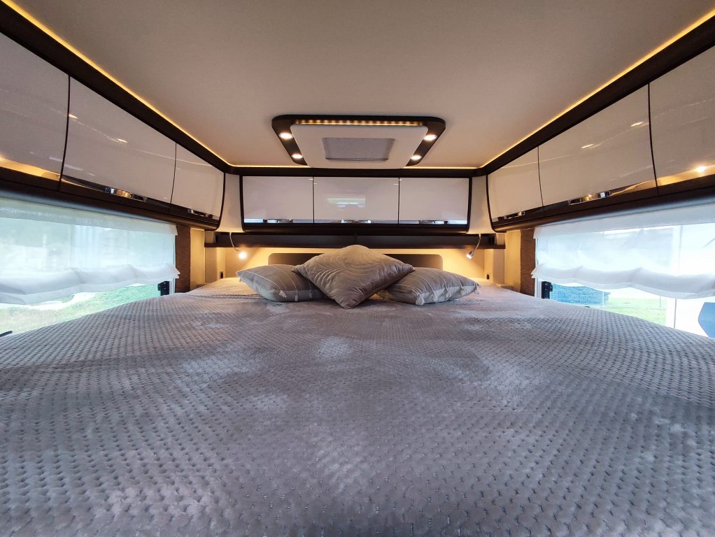 Na pokładzie oprócz lodówki, zamrażarki, kuchenki gazowej nie zabraknie takich udogodnień jak kuchenka mikrofalowa, zmywarka do naczyń, odkurzacz bezprzewodowy, klimatyzacja postojowa, antena satelitarna, ekspres do kawy, TV 40” w salonie oraz 27” w sypialni, przetwornica 12V/230V o mocy 3000W, a także elektrycznie wysuwana markiza o długości 6 metrów.