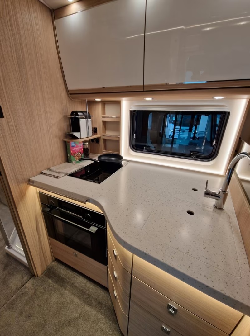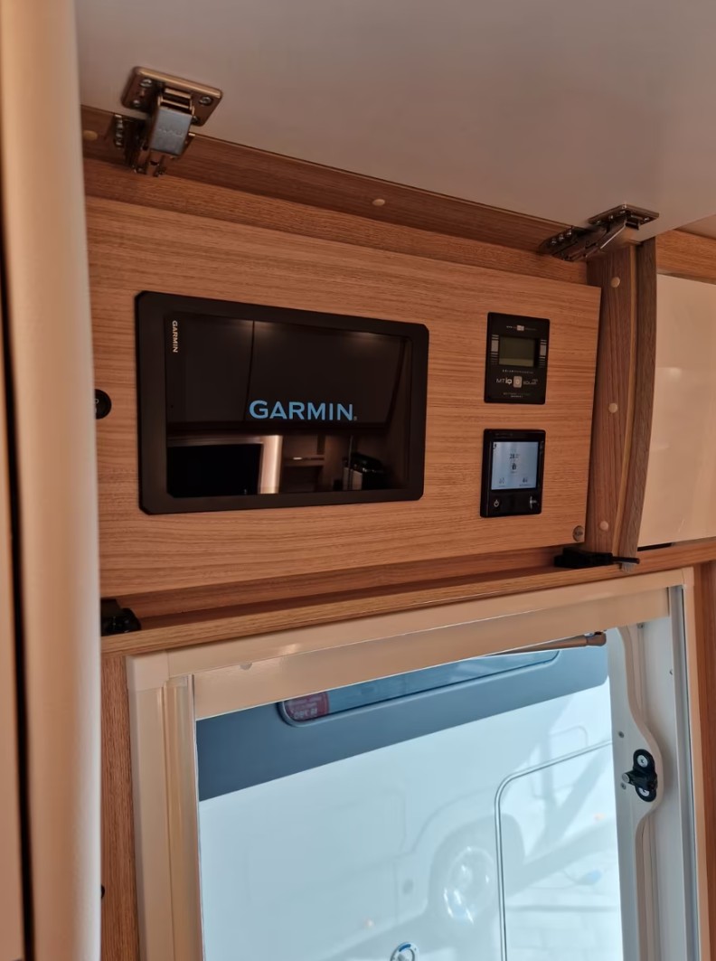 Elektrycznie chowany telewizor 39″ w górnej szafce w jadalni (po stronie pasażera) ze szklankami oraz telewizor 27″ w sypialni