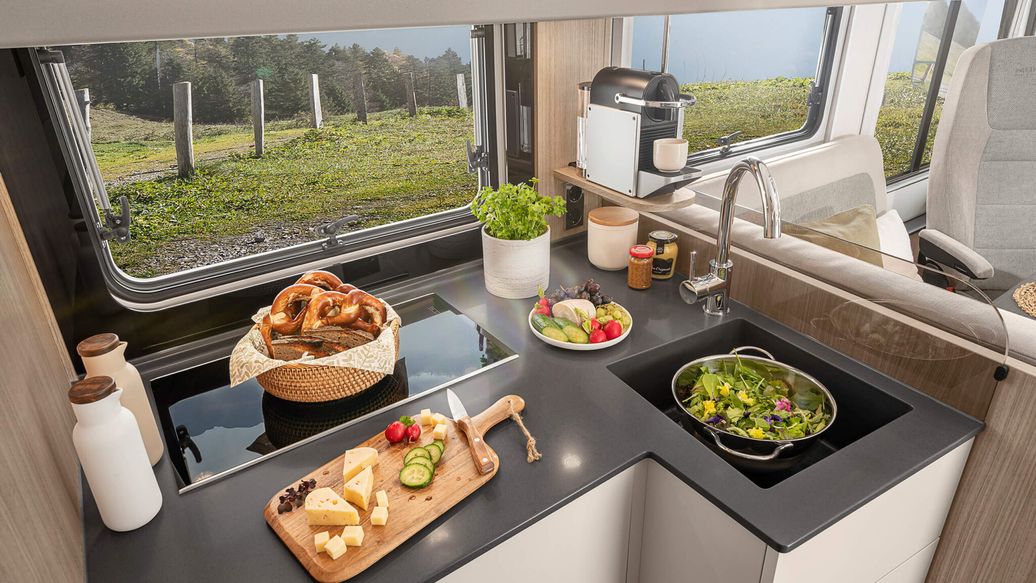 Mała, ale pełna możliwości. W MORELO HOME kompaktowa kuchnia zachwyca przestrzenią do swobodnego poruszania się i przemyślanym układem. Gotowanie odbywa się tu nie na gazie, lecz komfortowo i bezpiecznie — elektrycznie, nowocześnie, wydajnie i zawsze gotowe do użycia. Wysokiej jakości urządzenia i sprytne schowki ułatwiają przygotowywanie kulinarnych przysmaków także w podróży. Każdy centymetr przestrzeni zamienia się w moment przyjemności.